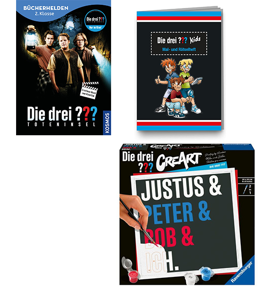 Häfft.de verlost unter allen Teilnehmer:innen ein Gewinnpaket, bestehend aus einem Die drei ??? Erstlese-Buch zum Film 2. Klasse Toteninsel von KOSMOS Verlag, einem Die drei ??? Kids Mal- und Rätselheft von DH Konzept und einem CreArt Adults Trend - Die drei ??? von Ravensburger.