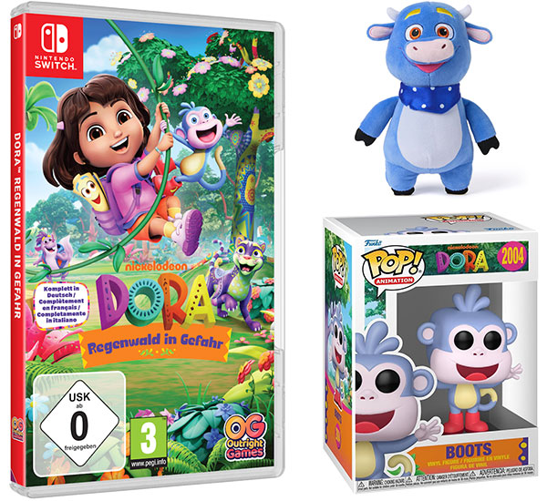Häfft.de verlost unter allen Teilnehmer:innen zwei Spiele DORA™: REGENWALD IN GEFAHR für Nintendo Switch, eine Benny Plüsch Figur von Spin Master einmal BOOTS - DORA THE EXPLORER von Funko Europe.