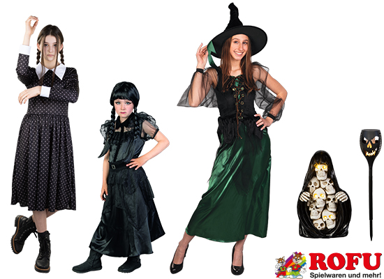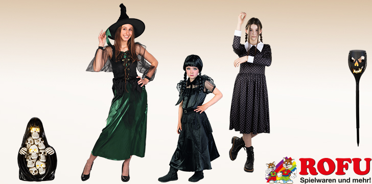 Selbstverständlich bietet ROFU neben Wednesday und der grünen Hexe auch eine große Auswahl an klassischen und zeitlos-furchtbaren Grusel-Kostümen: Von Skelett bis Vampir, von Zombiebraut bis Sensenmann, von Horror-Clown bis Gespenst finden kleine und große Schreckgestalten ihr passendes Outfit.